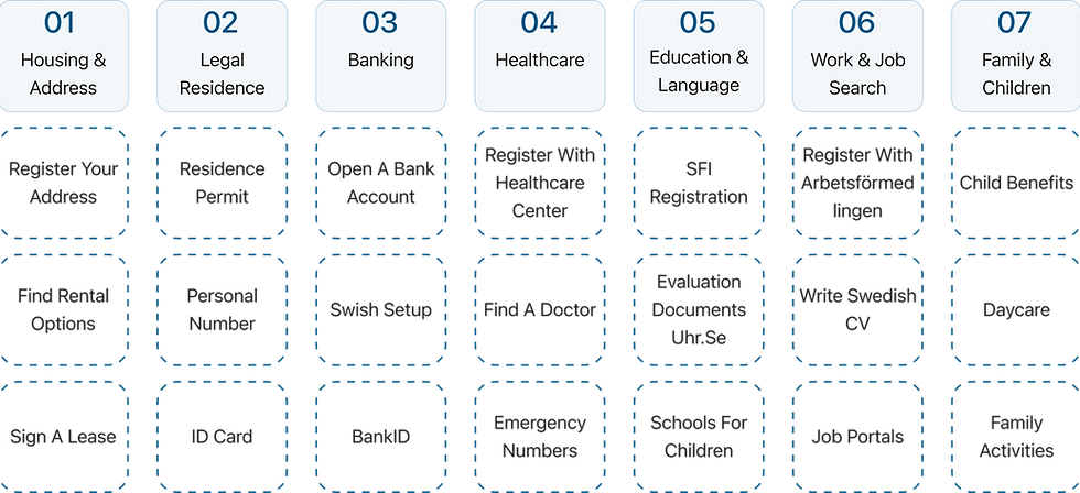 The information architecture of ImmigrAid organizes complex migration-related tasks into clear, step-by-step categories, helping newcomers to Sweden easily find and act on essential information.